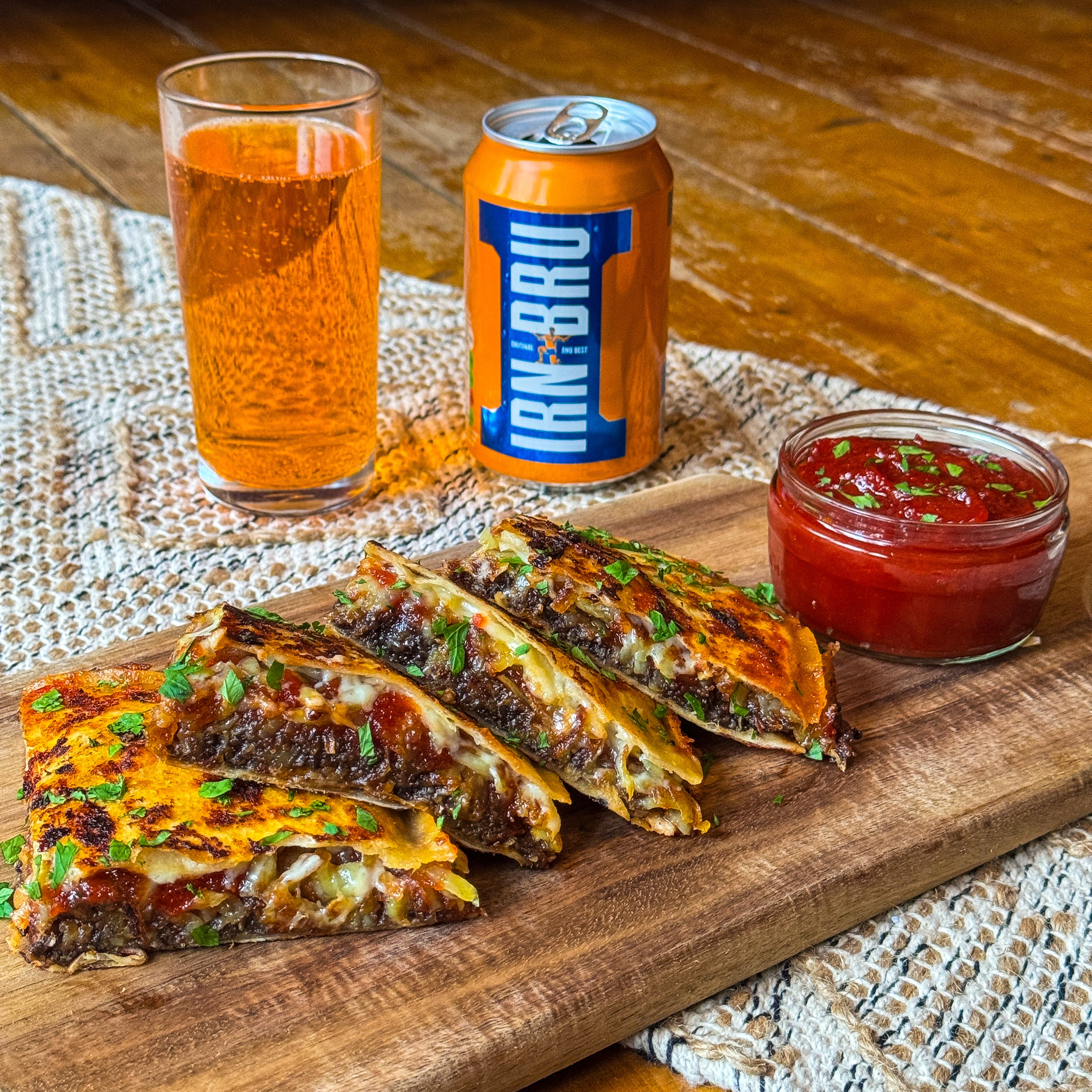 Fry in the same pan you made the chilli jam (with lid on) on both sides until cheese is melted and outside is crispy - Cut into 4 and serve with some fresh parsley garnish, some extra chilli jam for dipping and a nice cold glass of IRN-BRU